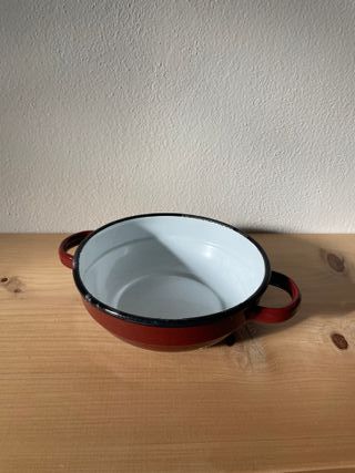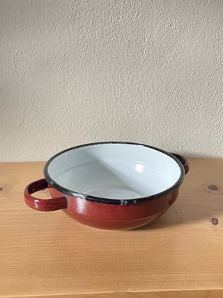 Pentolino vintage in metallo smaltato colore Rosso Marrone con bordo nero ed interno bianco Oggetto autentico anni ’60-’70 in buone condizioni Ottimo come oggetto decorativo per arredamento in stile country. Diametro 19cm , Altezza 7cm Posso fare spedizioni combinate con altri oggetti da me proposti.