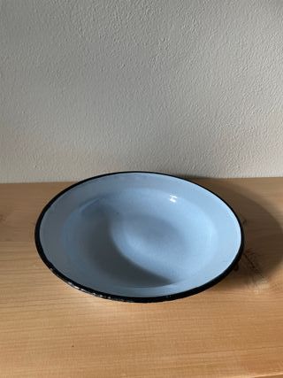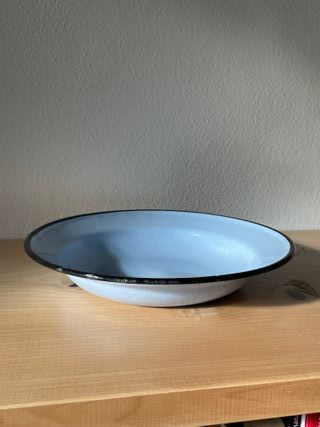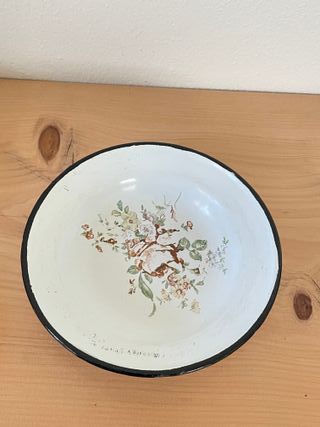 Ciotola vintage in metallo smaltato risalente agli anni 60-70. Colore bianco con bordo nero. Diametro 23 cm, altezza 4 cm Perfetto per esposizione o collezione. Posso fare spedizioni combinate con altri oggetti da me proposti