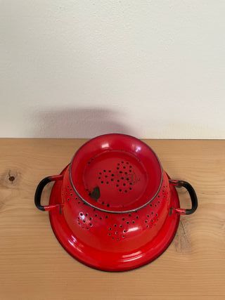 Scolapasta vintage in metallo smaltato colore rosso con bordi nero Oggetto autentico anni ’60-’70, Un vero pezzo da collezione, molto decorativo per arredamento in stile country o per progetti di recupero Condizioni buone, con qualche segno del tempo come da foto Diametro 25cm , Altezza 12cm Posso fare spedizioni combinate con altri oggetti da me proposti.