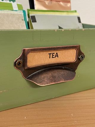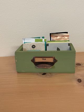 Elegante scatola per organizzare le tue bustine di tè o spezie. Realizzata a mano in legno di pino, dipinta in color Verde con dettaglio porta etichetta in metallo. Dimensioni 16x7,5cm altezza 6cm Fornita con doppia etichetta per Spezie