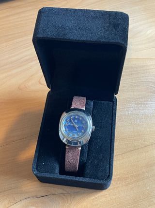 Orologio vintage dell'Unione Sovietica, risalente agli anni '70, prodotto dalla Luch (Луч) perfettamente funzionante. Il quadrante è di un intenso colore blu e scritta in cirillico сделано в CCCP (Made in Soviet Union)., la cassa in metallo lucido con tipica forma Space Age anni'70. Orologio a carica meccanica, riserva di carica di circa 40 Ore Dimensione cassa 34mm , Misura cinturino 14mm Cinturino in pelle nuovo e scatola porta orologio come da foto inclusa