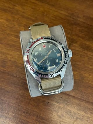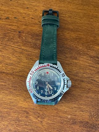 Orologio Vostok Komandirskie Sommergibilisti funzionante ed in ottime condizioni estetiche, Riserva di carica di oltre 40 Ore. Movimento meccanico a carica manuale Vostok 2414a con 17 rubini e datario. Orologio iconico, Quadrante Celeste con indici bianchi, stella rossa ad ore 12 con sommergibile ed Ancora ad ore 6. Possibilità di scegliere uno dei 2 cinturini in foto, entrambi nuovi In Corda Nato Beige e In Pelle Scamosciata Verde