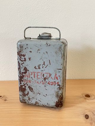 Cassetta medica militare originale degli anni '60 in metallo. In dotazione ad eserciti dell'europa dell'Est sotto il Patto di Varsavia. Segni di usura dovuti all'età che ne testimoniano l'autenticità. Contiene 1 confezionie originale e ancora sigillata di bendaggio