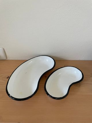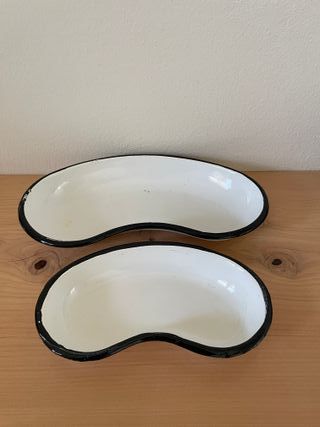 Set di due vassoi medici vintage in smalto bianco con bordo nero. Design a forma di rene, realizzati in metallo smaltato. Posso fare spedizioni combinate con altri oggetti da me proposti