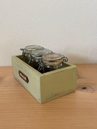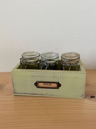 Elegante porta spezie in legno, perfetto per organizzare le tue erbe aromatiche e condimenti. Realizzata a mano in legno di pino, dipinta in color Verde con dettaglio porta etichetta in metallo. Dimensioni 16x9cm altezza 6cm Fornita con doppia etichetta per bustine di Tea