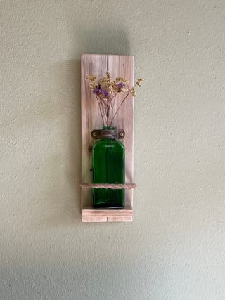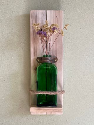 Elegante vaso da parete realizzato in legno di recupero e corda in Iuta naturale. Perfetto per aggiungere un tocco rustico e naturale alla tua casa. La bottiglia verde inclusa crea un contrasto cromatico interessante. Dimensioni 29x9cm