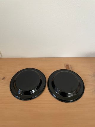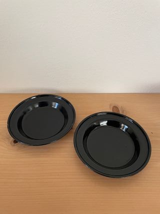 Set di due piatti vintage in metallo smaltato di colore nero. Diametro 16cm Oggetti autentici risalenti agli anni 60-70, condizioni ottime, con qualche segno del tempo a garanzia dell'autenticità. Posso fare spedizioni combinate con altri oggetti da me proposti