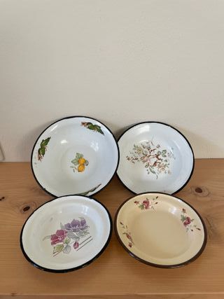 Set di quattro piatti in metallo smaltato, con decorazioni floreali e fruttate. Diametro 20cm, 18cm, e 2 da 16cm Oggetti risalenti agli anni '60-'70 Posso fare spedizioni combinate con altri oggetti da me proposti