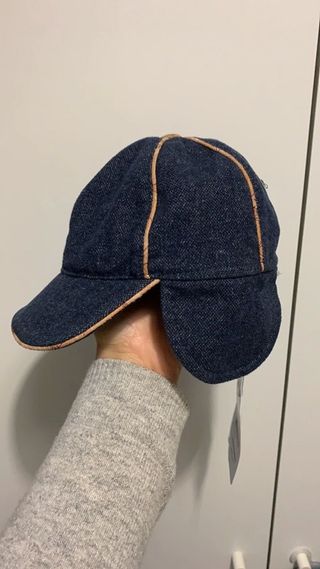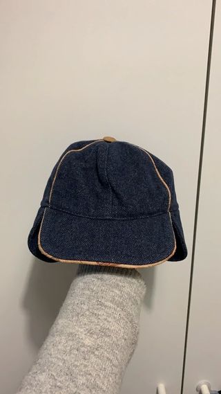 Berretto per neonato firmato Alviero Martini, perfetto per proteggere dal freddo. - Design con paraorecchie. - Materiale in denim blu. - Rifiniture in contrasto. - Ideale per i più piccoli.