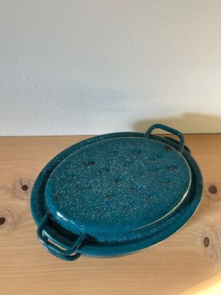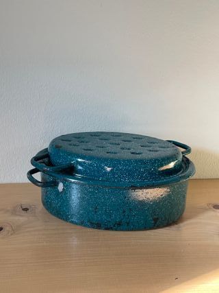 Pentola ovale in metallo smaltato di colore verde. Dimensioni 28x20cm, altezza 13,5 cm Perfetto per esposizione o da usare come contenitore Posso fare spedizioni combinate con altri oggetti da me proposti