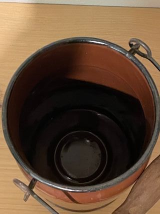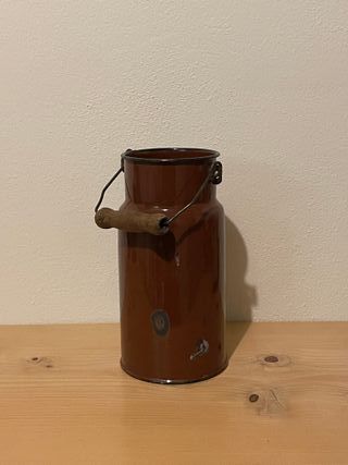 Vecchio contenitore da latte da 2 Litri realizzato in metallo smaltato con manico in legno. Colore Marrone, condizioni buone, con qualche segno del tempo. Dimensione 23,5cm x 12cm Ottimo come oggetto da arredamento in stile provenzale, country o come contenitore per fiori.