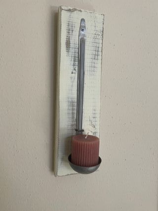 Elegante porta candele da appendere alla parete, realizzato con legno di recupero e un vecchio mestolo, Verniciato in color avorio e decapato in stile Shabby chic Dimensione 32cm x 9cm Candela come da foto inclusa