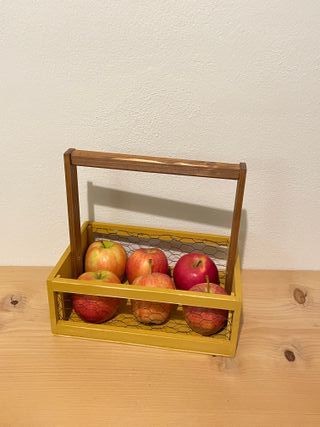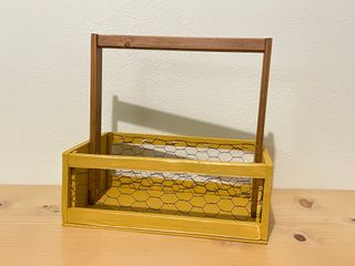 Elegante cestino artigianale realizzato in legno con finitura gialla in stile shabby chic e dettagli in rete metallica. Ottimo come cestino per la frutta o per il pane. Dimensioni 18x26cm