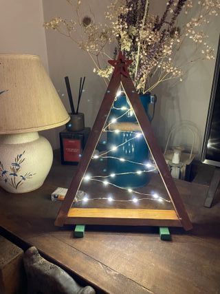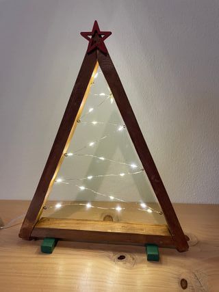 Albero di Natale in legno con luci a Led. Realizzato a mano con legno di recupero , dimensioni 27 largo , alto 31 cm. Funziona con 2 Batterie AA , incluse.