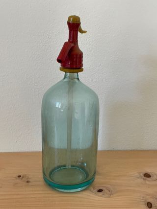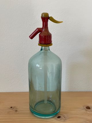 Sifone per soda vintage degli anni '60, realizzato in vetro azzurro. Un pezzo d'epoca per la tua casa. Testa in plastica riportante il luogo di fabbricazione. Oggetto completo ed originale in tutte le sue parti