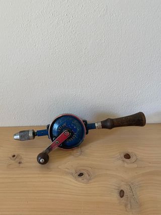 Trapano a mano vintage, modello RECORD N.123, fabbricato in Inghilterra. Oggetto vintage anni '60 ben conservato e funzionante - Corpo principale in metallo blu. - Manico superiore e impugnatura in legno scuro. - Mandrino in metallo.