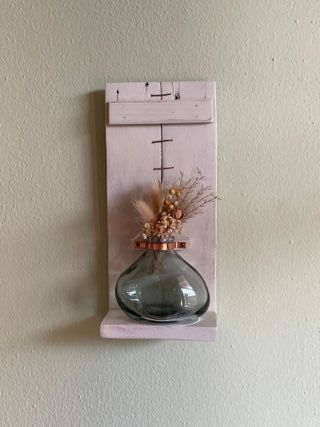 Elegante vaso da parete in stile shabby chic, perfetto per aggiungere un tocco di design alla tua casa. Realizzato in legno di recupero e dipinto di beige con un contenitore in vetro trasparente, ideale per piccole composizioni floreali. Dimensioni 30x13cm