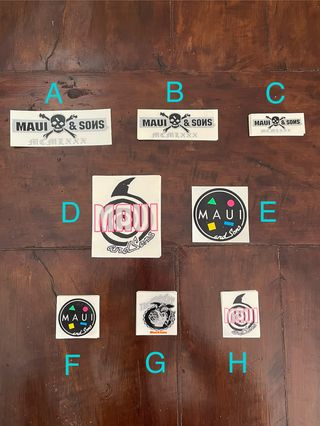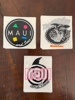 Bellissimi adesivi del marchio Maui&Sons. Sono coloratissimi e in ottime condizioni. Vedere foto per dettagli Tipo A - 1 Pezzi 12,5x4,5cm Tipo B - 3 Pezzi 10x4cm Tipo C - 20 Pezzi 6,5x3cm Tipo D - 5 Pezzi 8,5x10cm Tipo E - 1 Pezzi 7x7cm Tipo F - 7 Pezzi 5x5cm Tipo G - 12 Pezzi 5x5cm Tipo H - 4 Pezzi 4,5x5,5cm