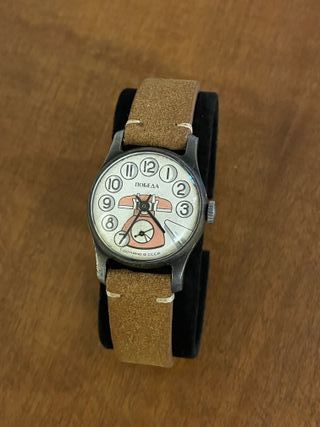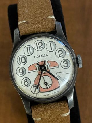 Orologio Pobeda vintage dell'Unione Sovietica, risalente agli anni '70, funzionante ed in ottime condizioni. Quadrante bianco con raffigurato un telefono e scritta in cirillico a ore 6 сделано в CCCP (Made in Soviet Union). Orologio a carica meccanica, riserva di carica di circa 40 Ore Dimensione cassa 32mm , Misura cinturino 16mm Cinturino in pelle nuovo come da foto.