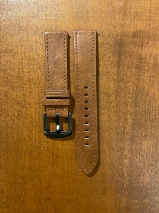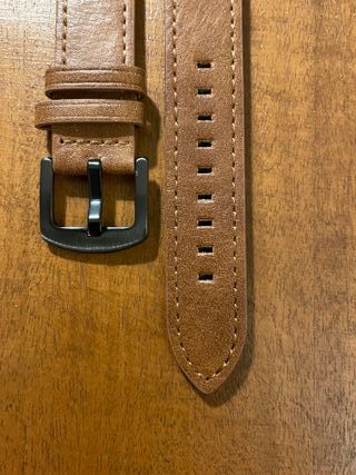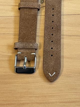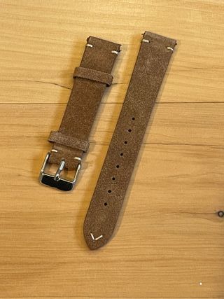 Cinturino in pelle scamosciata morbida adatto ad orologi con anse da 20mm. Colore Marrone chiaro con cuciture bianche. Il cinturino è dotato di clip per l'installazione e non necessita quindi di anse aggiuntive (sgancio rapido) Cinturino nuovo, mai usato