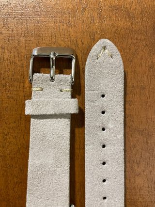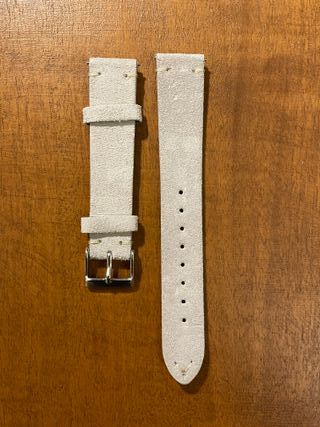 Cinturino in pelle scamosciata morbida adatto ad orologi con anse da 14mm. Colore Bianco Perla-Grigio chiaro con cuciture bianche. Il cinturino è dotato di clip per l'installazione e non necessita quindi di anse aggiuntive (sgancio rapido) Cinturino nuovo, mai usato