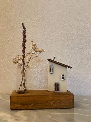 Decorazione in Legno con piccola casetta e vaso a tubo in vetro. Adatto come ferma carte da scrivania, contenitore per matite o come decorazione da ambiente aggiungendo fiori secchi o freschi. Interamente artigianale , realizzata con legno di recupero Misure 15x6cm altezza 11cm #shabby #country #boho #decorazioneinlegno #handmade #fattoamano #prodottoartigianale