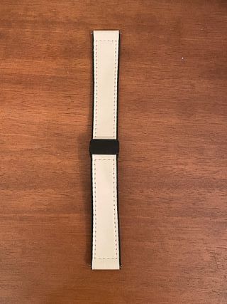 Cinturino morbido adatto ad orologi con anse da 20mm. Colore Bianco Panna-Beige, con fibbia nera a scomparsa Il cinturino è dotato di clip per l'installazione e non necessita quindi di anse aggiuntive (sgancio rapido) Cinturino nuovo, mai usato