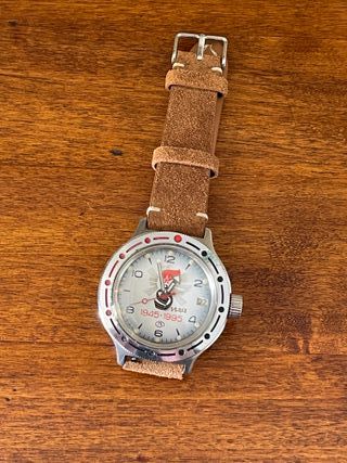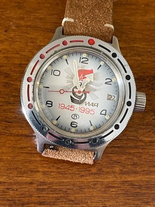 Orologio Vostok Amphibia commemorativo del 50°Anniversario della Vittoria - 9 Maggio. Funzionante ed in ottime condizioni. Movimento automatico. Cinturino in pelle scamosciata nuovo , come da foto, incluso