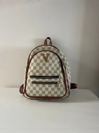 Zaino donna con un elegante motivo a V ripetuto su tutta la superficie. I dettagli in ecopelle marrone aggiungono un tocco di classe. - Chiusura principale con zip. - Tasca frontale con zip. - Logo V dorato sul davanti.