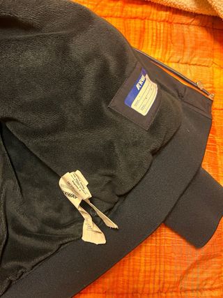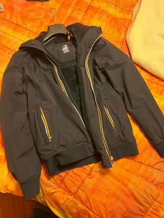 Giubbotto K-Way per ragazzo/a, taglia 14 anni. Colore blu scuro, con cappuccio e fodera interna. - Zip frontale con doppio cursore. - Tasche laterali con zip. - Polsini e fondo elasticizzati.