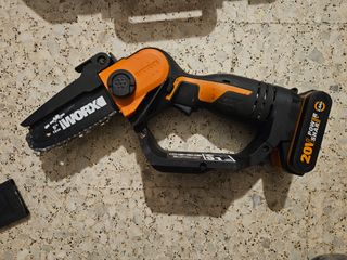 Motosega a batteria Worx, compatta e maneggevole. - Barra da 5 (12cm). - Batteria Power Share 20V 2.0Ah inclusa. - Colore arancione e nero. Motosega + batteria No caricatore