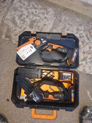 Set di due motoseghe Worx, ideali per lavori di giardinaggio. 2 motoseghe + 3 batterie + 1 caricatore + REGALO 1 motosega nuova ma non funzionante - Motosega elettrica senza fili. - Batteria Worx 20V - Caricabatterie incluso. - Valigetta per il trasporto.