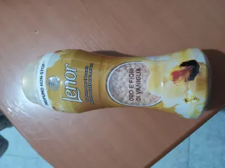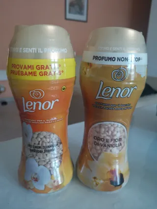 Profumo per bucato Lenor in perle, profumazione Oro e Fiori di Vaniglia. - Fragranza persistente per un bucato fresco a lungo. - Perle profumate da inserire direttamente in lavatrice. - Fragranza: Orchidea Dorata (Gold Orchid). il tubo piu grande è aperto ma pieno