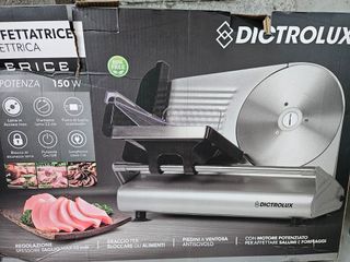 Affettatrice DICTROLUX in metallo e plastica. - Design moderno e compatto. - Lama in acciaio inossidabile. - Base antiscivolo per maggiore stabilità. - 150W