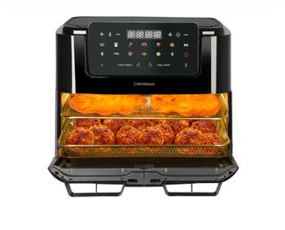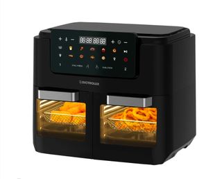 Friggitrice ad aria calda Dictrolux con doppia capacità da 12 litri. Ideale per cucinare più pietanze contemporaneamente. - Due cestelli indipendenti. - Funzione Sync Finish per terminare la cottura nello stesso momento. - Funzione Dual Cook per cucinare cibi diversi con impostazioni diverse. - Pannello di controllo digitale con programmi preimpostati. N.B. una luce interna non accende