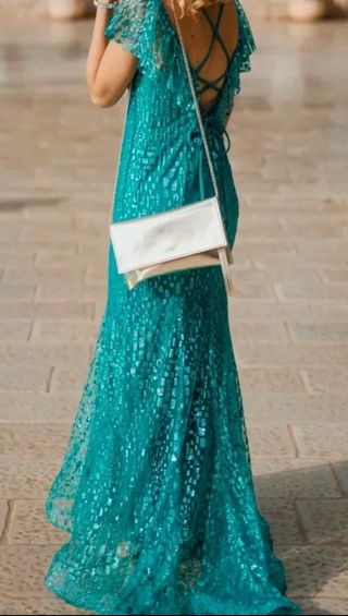 Abito lungo elegante color verde acceso con tessuto leggero e luminoso, arricchito da una delicata lavorazione effetto paillettes che riflette la luce con discreta eleganza Scollo a V profondo che valorizza il décolleté, maniche corte morbide e romantiche. La schiena è uno dei punti forti: aperta con raffinato intreccio di laccetti regolabili, molto femminile. Linea aderente sul busto e sui fianchi, con gonna fluida che cade morbida fino a terra creando movimento e sensualità. Perfetto per cerimonie, eventi serali o occasioni speciali.
