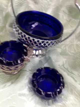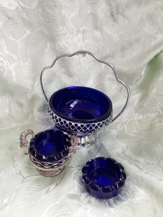 Elegante set di tre pezzi in vetro blu cobalto con finiture argentate. - Ciotola centrale con manico decorato. - Due contenitori più piccoli, uno con manici. - Dettagli traforati in metallo argentato.