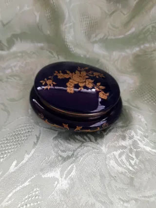Elegante portagioie antico di colore blu intenso, impreziosito da decorazioni floreali dorate. - Finitura lucida. - Dettagli in oro. - Design ovale.
