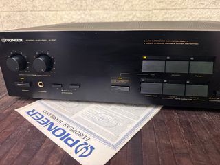 Pioneer A-331 Amplificatore integrato stereo Ottime condizioni e perfettamente funzionante Specifiche; Potenza d'uscita: 40 watt per canale su 8Ω (stereo) Risposta in frequenza: da 5Hz a 80kHz Distorsione armonica totale: 0,02% Sensibilità d'ingresso: 2,5mV (MM), 150mV (linea) Rapporto segnale/rumore: 88dB (MM), 100dB (linea) Uscita: 150mV (linea) Impedenza di carico degli altoparlanti: 4Ω (minima) Dimensioni: 420 x 316,5 x 120mm Peso: 8kg
