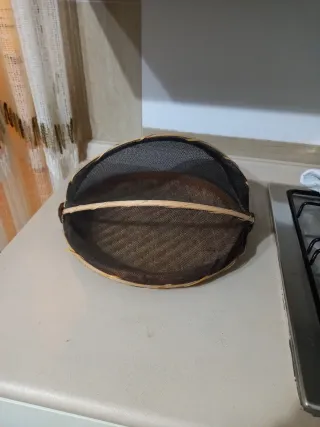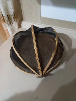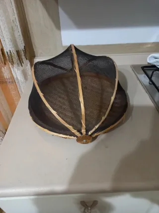 Cesto vintage con una rete protettiva. Ideale per conservare alimenti o come elemento decorativo. - Struttura in materiale intrecciato. - Rete fine per protezione. Misure diametro 33 cm