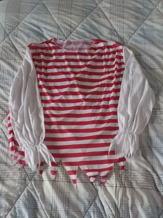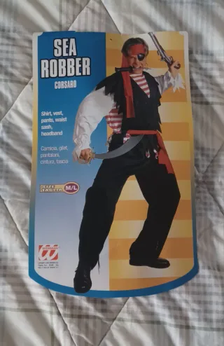 Costume Carnevale Pirata Spada Sigaro Cappello come nuovo. Indossato una sola volta. Misure in cm maglia a righe: da spalla a spalla 53, lunghezza manica 60, lunghezza maglia 70. Misure in cm pantaloni: lunghezza 100, vita (elastica) 43. Misura Gilet nero in cm: lunghezza 70. Taglia M - L