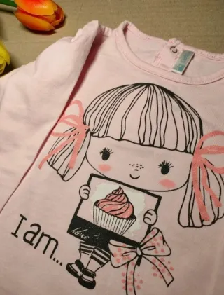 Maglia a maniche lunghe per bambina, color rosa. Marca Idexè - collo tondo - Stampa di una bambina con un cupcake. - Fiocchi rosa sui capelli e un fiocco grande in vita. - Scritta I am... sul davanti. - chiusura con bottoncini dietro al collo