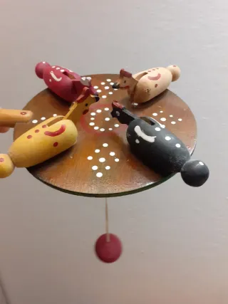Grazioso gioco vintage in legno con quattro uccellini colorati. - Base rotonda decorata. - Uccellini in legno dipinti a mano. - Manico in legno.