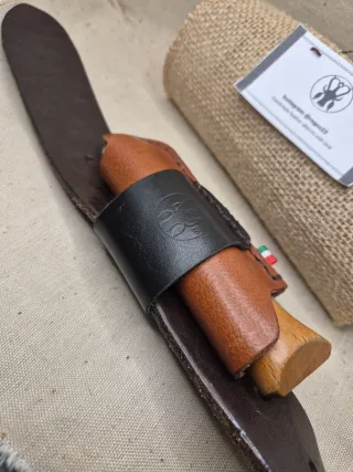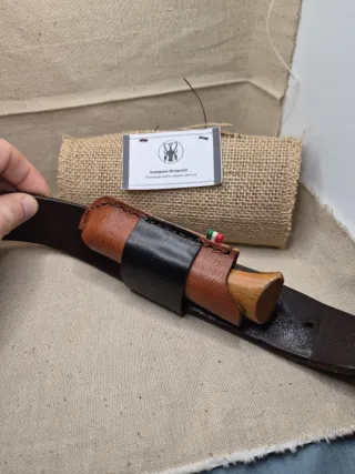 Custodia artigianale in cuoio per Opinel N.9. Realizzata a mano, permette un porto orizzontale. - Materiale: cuoio - Colore: cuoio naturale e nero - Chiusura: senza chiusura - Dettaglio: bandierina tricolore italiana Opinel 9 escluso dalla vendita