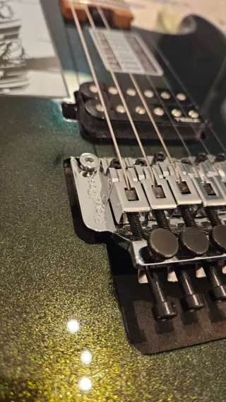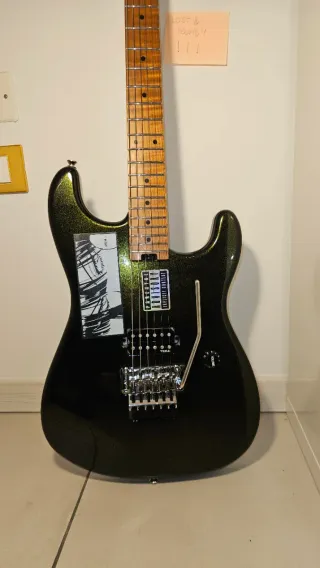 Chitarra elettrica Harley Benton ST-80FR MN con finitura Lime Sparkle. Corpo: tiglio americano Manico avvitato: acero canadese fiammato tostato Tastiera: acero canadese tostato con bordi arrotondati Dot inlays sulla tastiera e marcatori laterali fosforescenti Profilo del manico: C asimmetrico - spessore al 1° tasto: 20,5 mm/12° tasto: 23,5 mm Raggio compound della tastiera: 305 - 406 mm (12" - 16") Lunghezza della scala: 648 mm (25,50") Larghezza del capotasto: 43 mm (1,65") 22 tasti Medium Jumbo, in acciaio inossidabile ponte: floyd rose 1000 pickup: humbucker Tesla Plasma-X1b Alnico V Meccaniche Jinho J-02 con logo HB