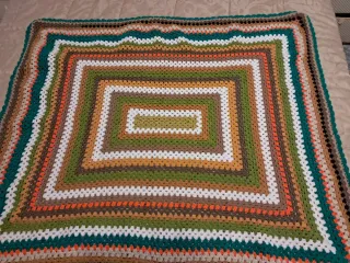 Coperta realizzata a mano con filato di lana, perfetta per aggiungere un tocco di calore e colore alla tua casa. 130x120 cm - Design a quadri concentrici. - Bordi rifiniti con cura.