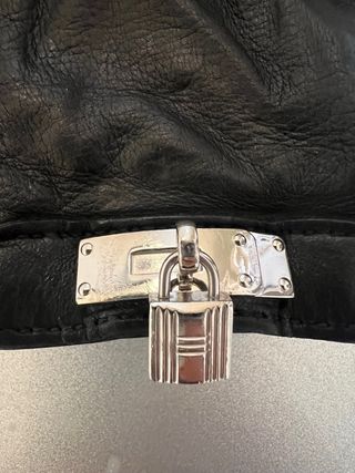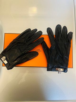 Eleganti guanti in pelle di agnello Hermès, modello Soya - Misura 7 - Dettaglio con chiusura con lucchetto Kelly - Buono stato esterno - Fodera interna rovinata - Completo di scatola, sacchetto e fattura Hermès
