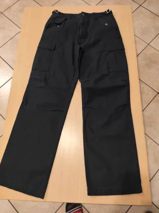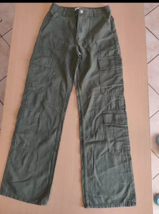 Pantaloni cargo Zara in un versatile color verde oliva. Modello comodo e pratico. Vita cm 34 lunghezza pantaloni 105 cm caviglia 23 cm #jeanscargo #pantalonicargo #zaracargo #zaraxs #zaraeur34 - Tasche laterali applicate. - Chiusura con zip e bottone. - Passanti per cintura.