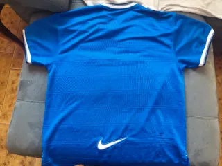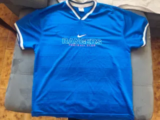 maglia da allenamento dei Glasgow Rangers prodotta da Nike, utilizzata nelle stagioni calcistiche dal 1997 al 1999. Questa maglia vintage, di un classico blu reale, presenta un colletto a V e bordi delle maniche bianchi con profili rossi. Il logo Nike e la scritta "RANGERS FOOTBALL CLUB" sono ricamati sul petto in bianco e rosso. #nikevintage #tshirtcalcio #tshirtfootballvintage