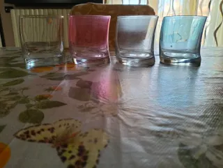 Set di quattro bicchieri in vetro, con sfumature di diversi colori. - Design moderno e originale. - Adatti per ogni occasione. Uno di questi ha perso la pellicola con la sfumatura champagne, gli altri presentano invece graffi nella parte superiore.